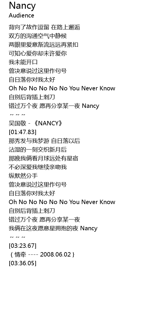 | [01:39.55] | 吴国敬 - 《NANCY》 |