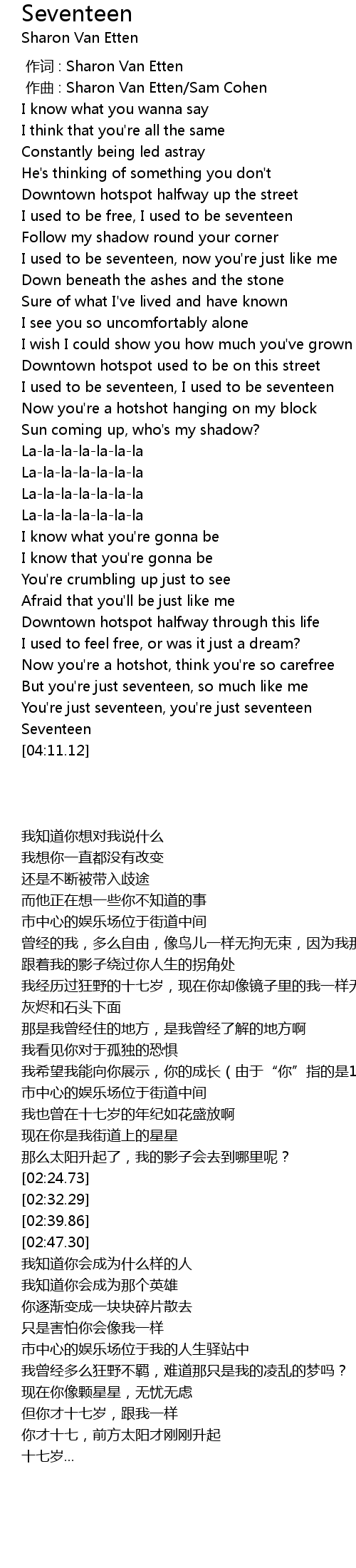 | [01:18.15] | I used to be seventeen, now you're just like me |