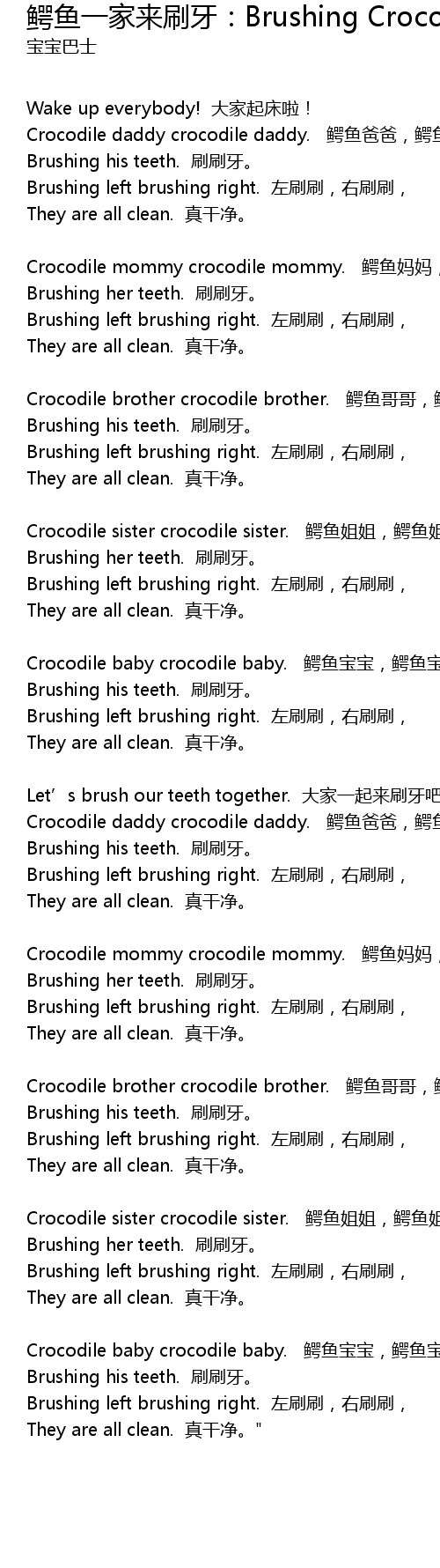 | Song | 鳄鱼一家来刷牙:Brushing Crocodile Family's Teeth |