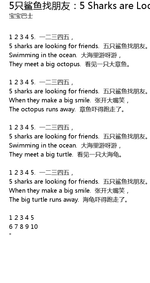 | Song | 5只鲨鱼找朋友:5 Sharks are Looking for Friends |
