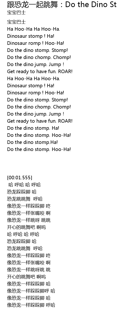 | [01:01.998] | Do the dino stomp. Hoo-Ha! |