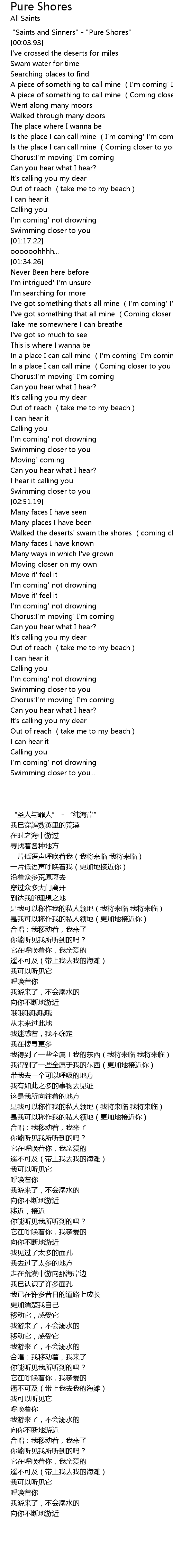 | [00:00.80] | " Saints and Sinners" " Pure Shores" |