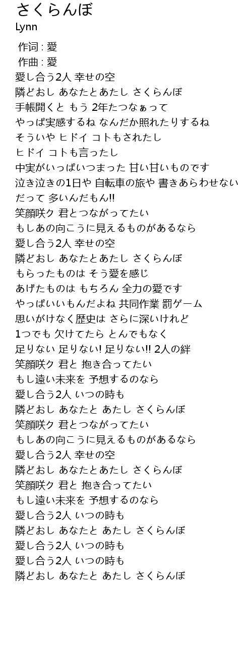 | [01:10.936] | 隣どおし あなたとあたし さくらんぼ |