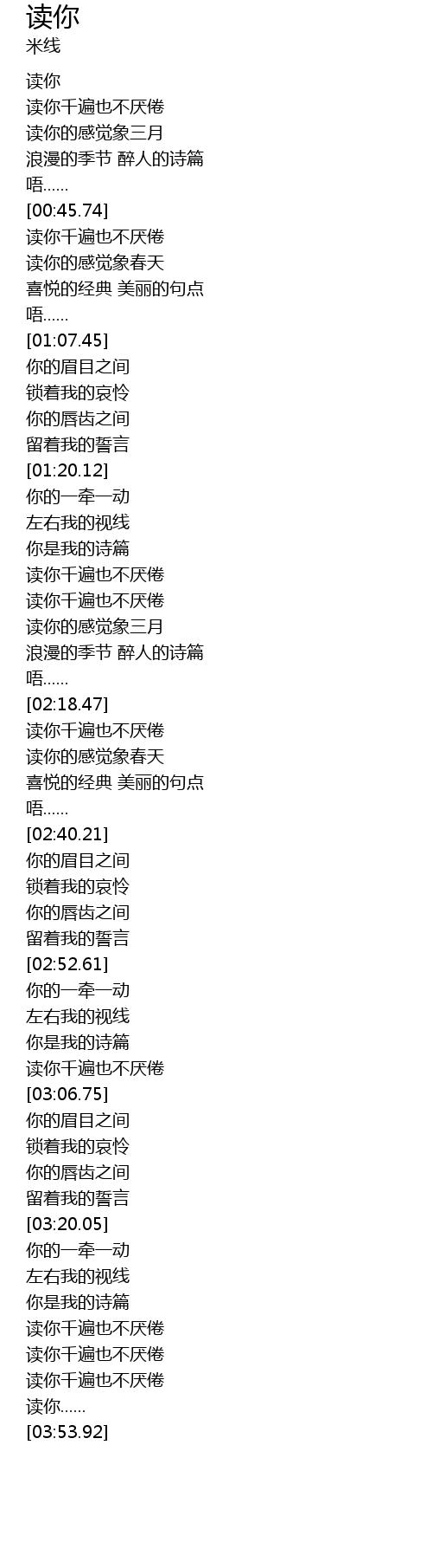 | [03:01.29] | dú nǐ qiān biàn yě bù yàn juàn |