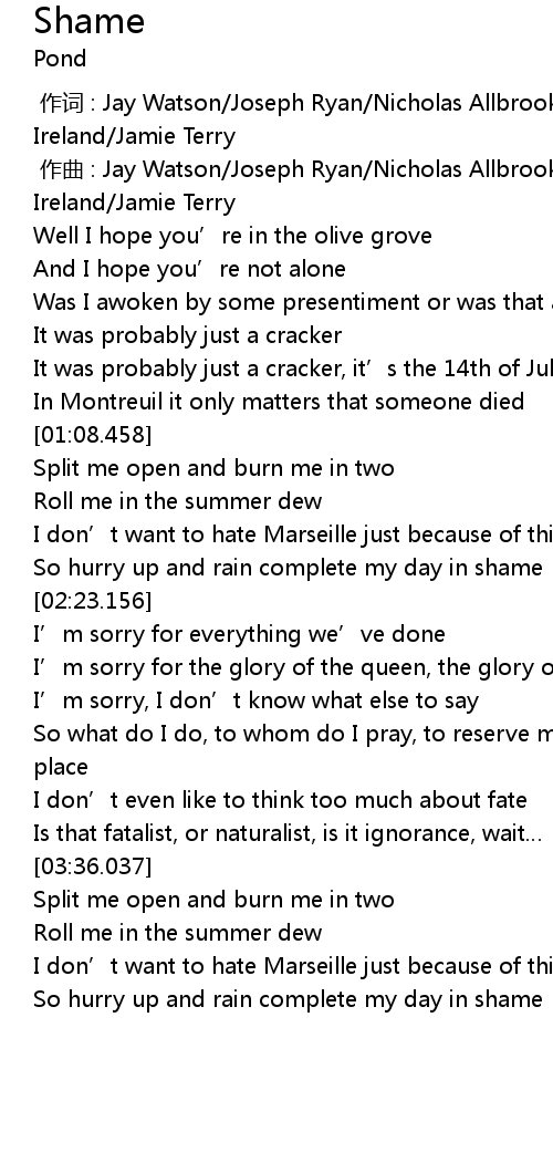 | [04:03.008] | So hurry up and rain complete my day in shame |