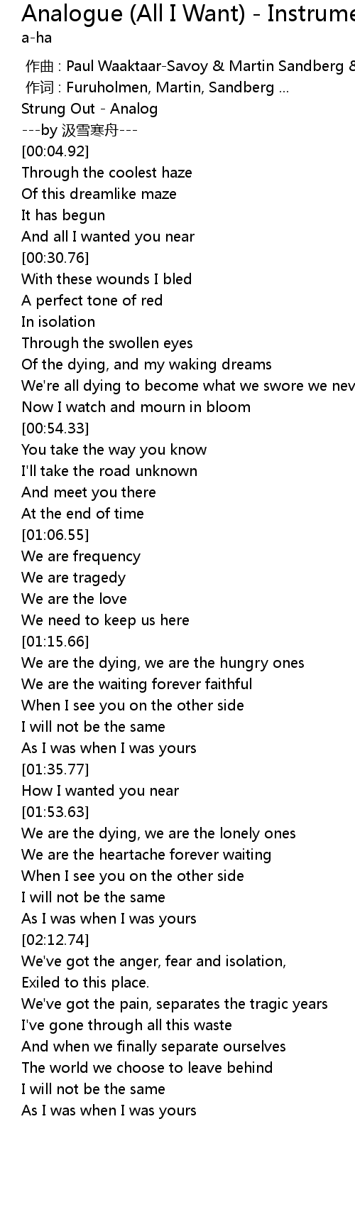 | [00:00.00] | 作曲 : Paul Waaktaar-Savoy & Martin Sandberg & Magne Furuholmen |