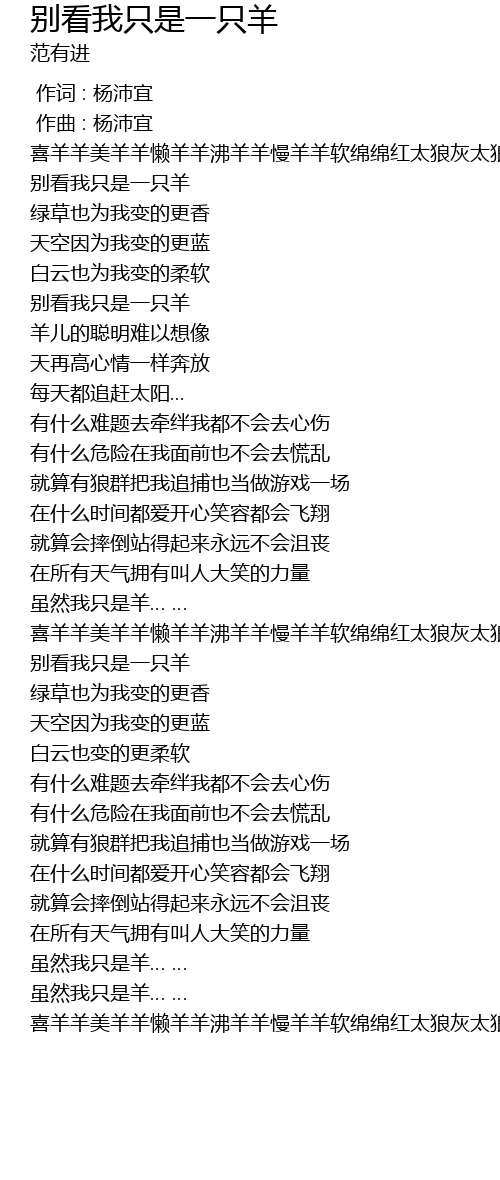 | [00:10.01] | 喜羊羊美羊羊懒羊羊沸羊羊慢羊羊软绵绵红太狼灰太狼 |