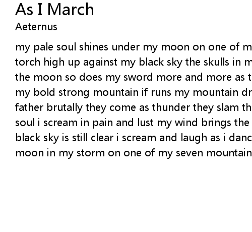 my pale soul shines under my moon on one of my bold mountains i stand i hold my torch high up against my black sky the skulls in my belt glow in the light of the moon so does my sword more and more as the unpure blood runs off and down on my bold strong mountain if runs my mountain drinks it calls the rain it calls my father brutally they come as thunder they slam their powers deep into my pale soul i scream in pain and lust my wind brings the rain from my mighty oceans my black sky is still clear i scream and laugh as i dance the dance of war under my moon in my storm on one of my seven mountains |