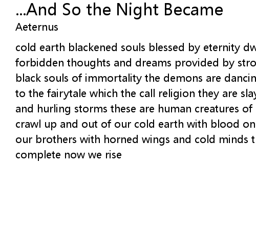 cold earth blackened souls blessed by eternity dwelling under unholy ground forbidden thoughts and dreams provided by strong storms of bold beliefs and black souls of immortality the demons are dancing creeping on the path clinging to the fairytale which the call religion they are slayed by our demons of war and hurling storms these are human creatures of a filthy and weak kind as we crawl up and out of our cold earth with blood on our hands and faces we greet our brothers with horned wings and cold minds the dwelling and feeding it is complete now we rise |