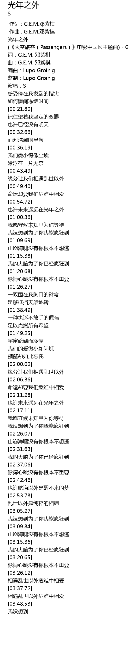 | [00:00.76] | 光年之外 (《太空旅客(Passengers)》电影中国区主题曲) - G.E.M. 邓紫棋 |