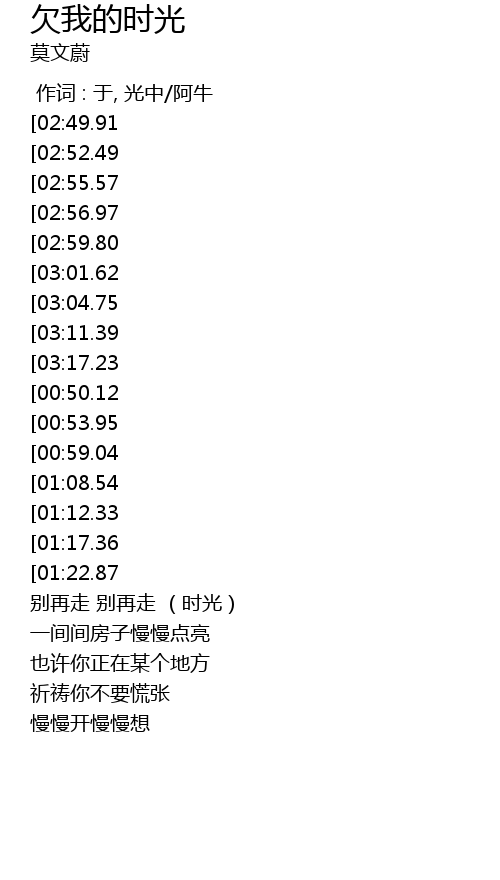 | [02:41.07][01:17.36] | 每次都说这是欠我的时光 |