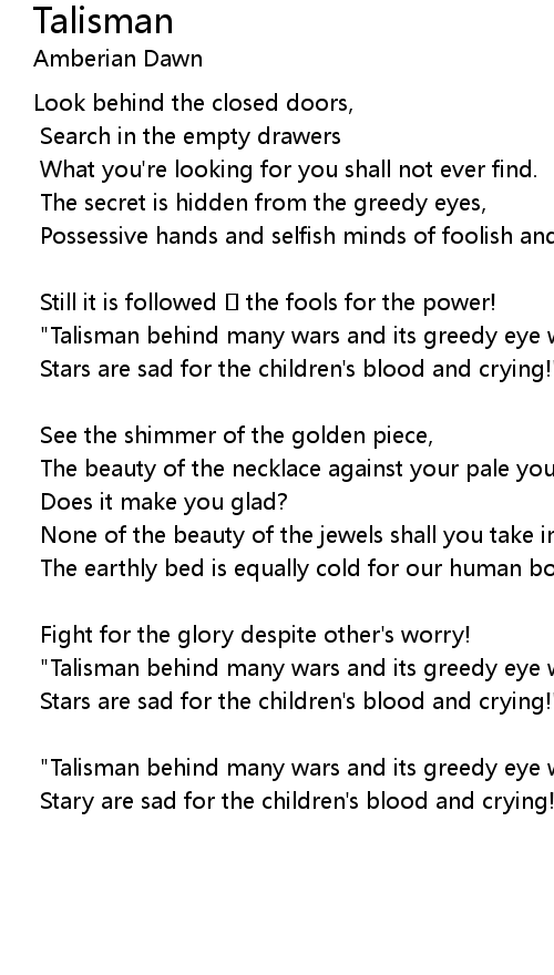| "Talisman behind many wars and its greedy eye wants more. | |
