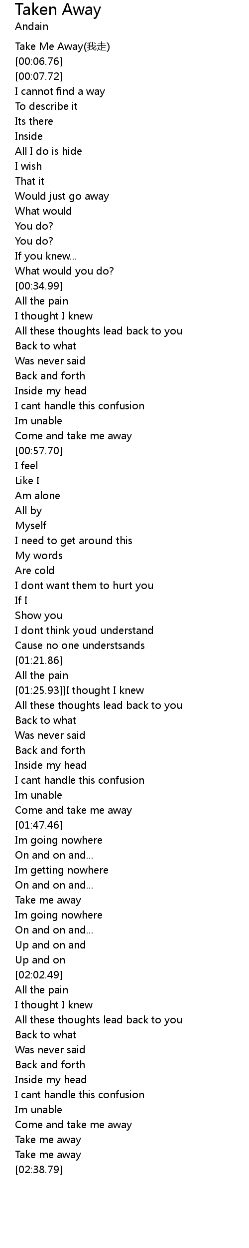 | [00:03.55] | Take Me Away wǒ zǒu |