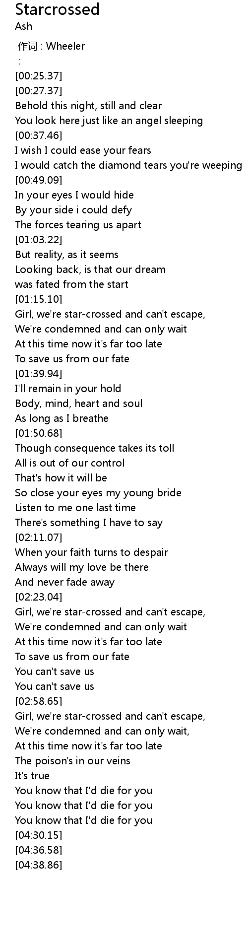 | [01:15.59] | Girl, we're star-crossed and can't escape, |