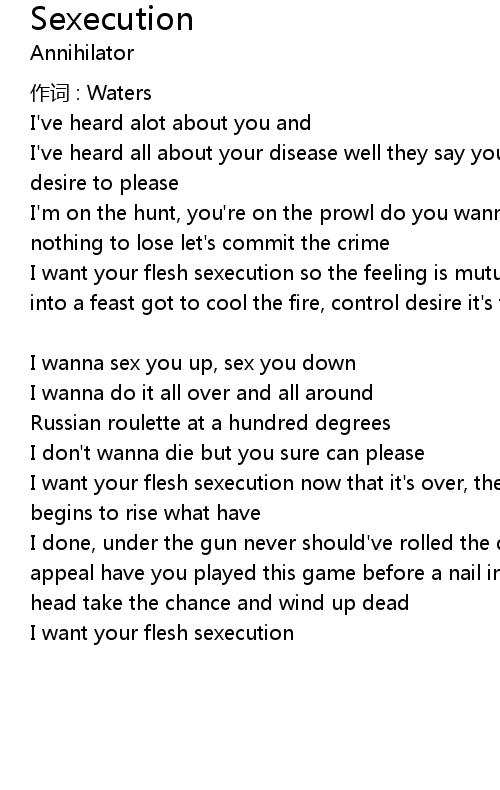 | I want your flesh sexecution so the feeling is mutual the hunger' s gonna turn into a feast got to cool the fire, control desire it' s time to unleash the beast | |