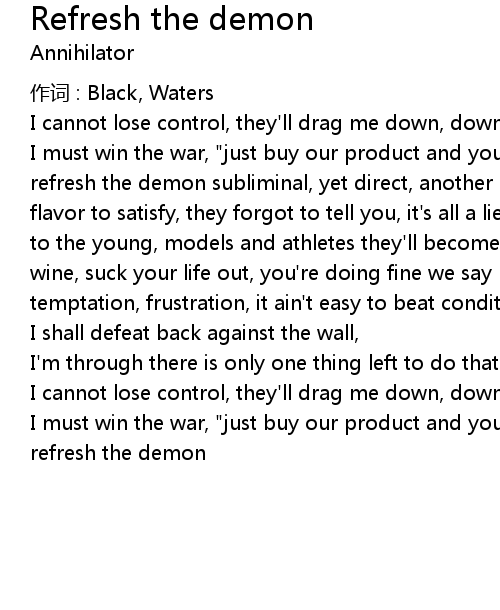 | I must win the war, " just buy our product and you' ll want more" we say refresh, refresh the demon subliminal, yet direct, another billion, to collect another flavor to satisfy, they forgot to tell you, it' s all a lie let' s raise a glass to the young, models and athletes they' ll become so sip the poison, sip the wine, suck your life out, you' re doing fine we say refresh, refresh the demon temptation, frustration, it ain' t easy to beat condition, addiction | |