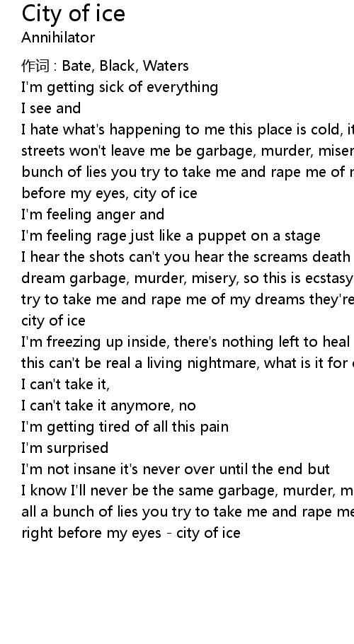 | I hate what' s happening to me this place is cold, it' s turning me to stone these streets won' t leave me be garbage, murder, misery, so this is ecstasy it' s all a bunch of lies you try to take me and rape me of my dreams they' re melting right before my eyes, city of ice | |