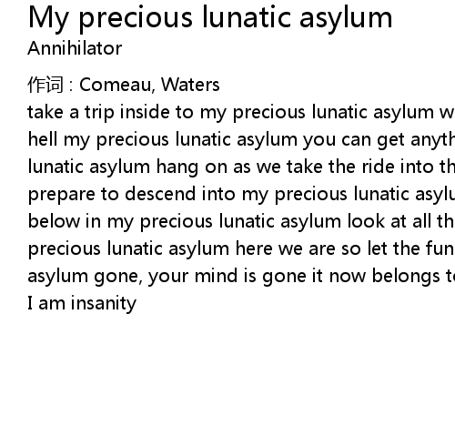 | take a trip inside to my precious lunatic asylum welcome, enter the house of hell my precious lunatic asylum you can get anything you need at the precious lunatic asylum hang on as we take the ride into the precious lunatic asylum prepare to descend into my precious lunatic asylum the ultimate insanity awaits below in my precious lunatic asylum look at all the tortured souls in the precious lunatic asylum here we are so let the fun begin in my precious lunatic asylum gone, your mind is gone it now belongs to me your mind is gone | |