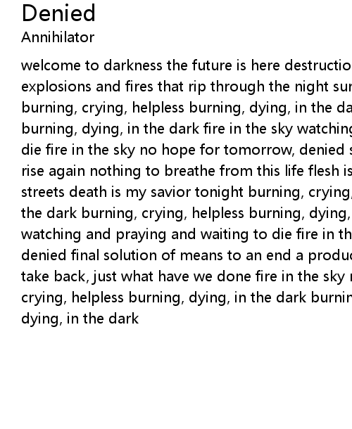welcome to darkness the future is here destruction and pain are my friends explosions and fires that rip through the night surrounded by bodies of death burning, crying, helpless burning, dying, in the dark burning, crying, helpless burning, dying, in the dark fire in the sky watching and praying and waiting to die fire in the sky no hope for tomorrow, denied smoldering ashes and flames rise again nothing to breathe from this life flesh is beginning to pour in the streets death is my savior tonight burning, crying, helpless burning, dying, in the dark burning, crying, helpless burning, dying, in the dark fire in the sky watching and praying and waiting to die fire in the sky no hope for tomorrow, denied final solution of means to an end a product of science and man no way to take back, just what have we done fire in the sky rules the land burning, crying, helpless burning, dying, in the dark burning, crying, helpless burning, dying, in the dark |