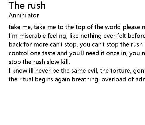 | I'm miserable feeling, like nothing ever felt before dealing, it's got me coming back for more can't stop, you can't stop the rush spreading out and taking all control one taste and you'll need it once in, you never leave it so don't try to stop the rush slow kill, | |