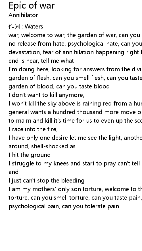 | war, welcome to war, the garden of war, can you smell war, can you taste hate, no release from hate, psychological hate, can you tolerate hate look at the devastation, fear of annihilation happening right before my eyes now that the end is near, tell me what | |