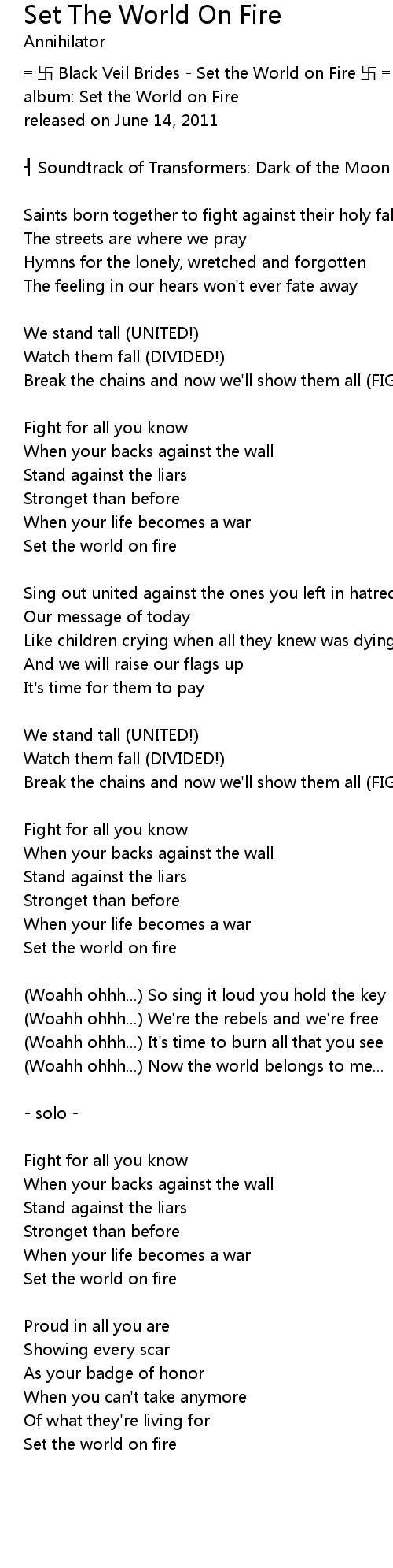 | Song | Set The World On Fire |