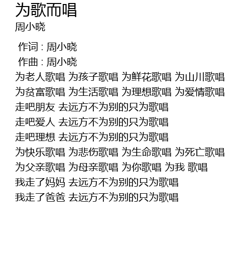 | [00:36.130] | wèi lǎo rén gē chàng wèi hái zi gē chàng wèi xiān huā gē chàng wèi shān chuān gē chàng |