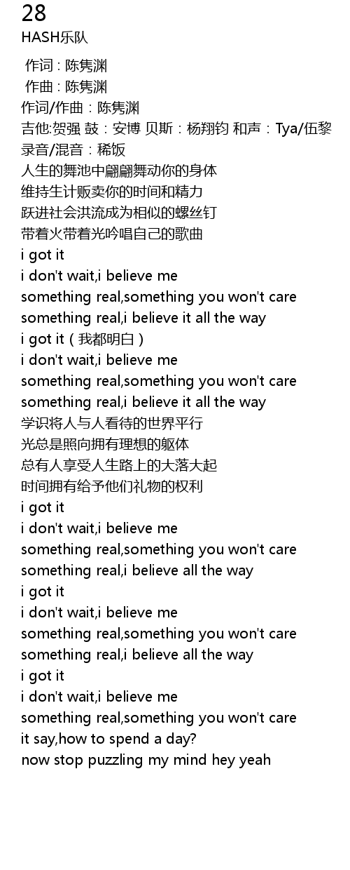 | [00:20.52] | 吉他:贺强 鼓:安博 贝斯:杨翔钧 和声:Tya/伍黎 |
