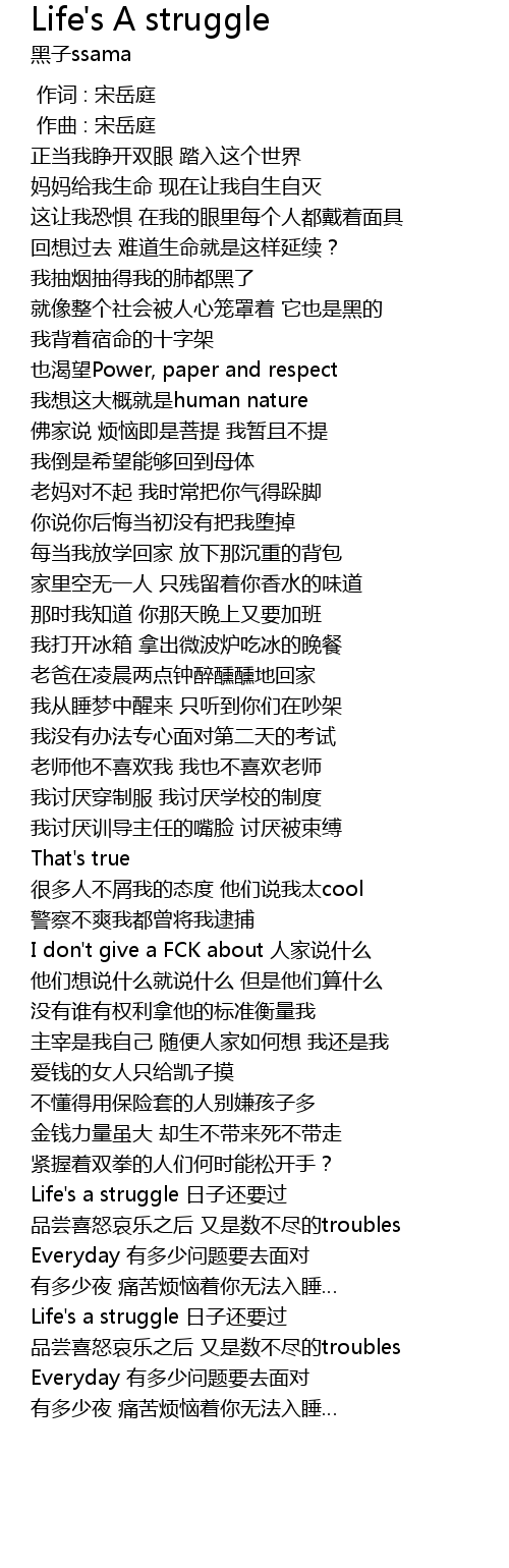 | [01:46.810] | Life' s a struggle rì zi hái yào guò |