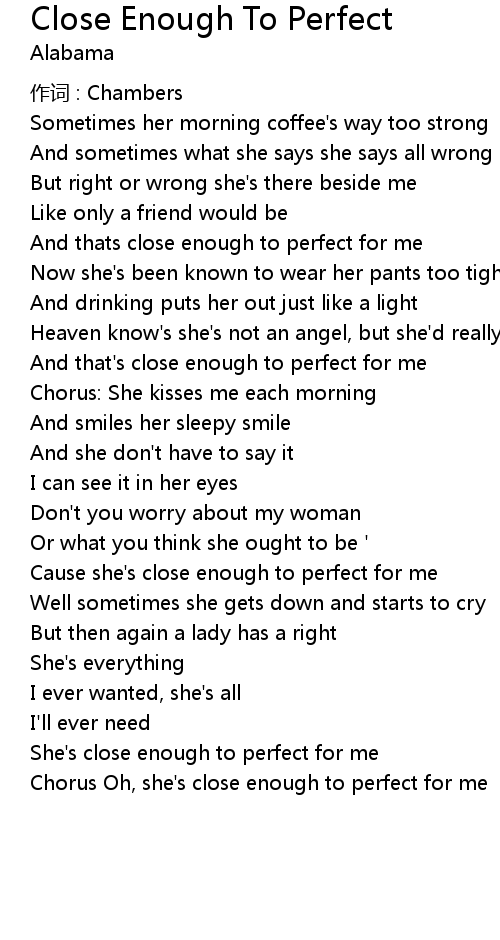 | Chorus Oh, she's close enough to perfect for me |
