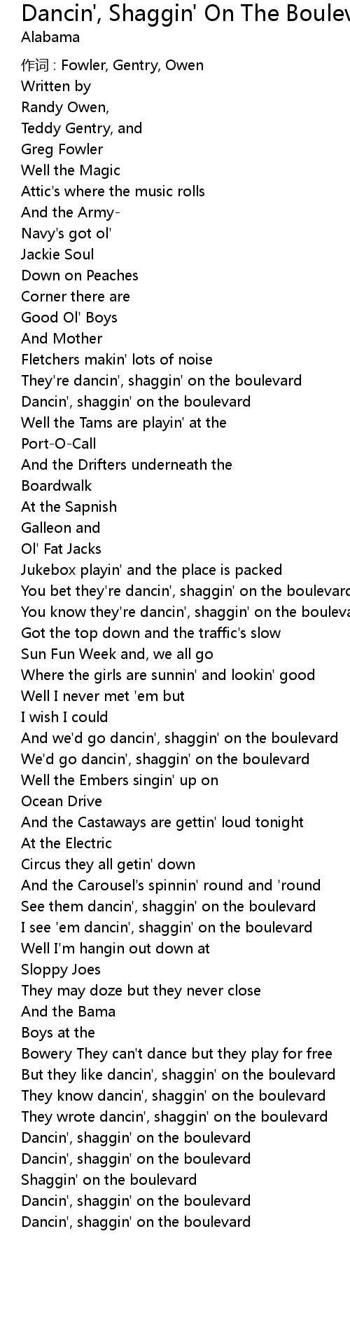 | You bet they' re dancin', shaggin' on the boulevard | |