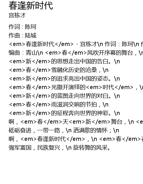 | <em>春逢新时代</em> - 宫栋才\n 作词:陈珂\n 作曲:陆城\n 编曲:青山\n <em>春</em>风吹开序幕的舞台,\n <em>新</em>的思想走出中国的告白。\n <em>春</em>雪融化历史的沧桑,\n <em>新</em>的追求亮出中国的姿态。\n <em>春</em>光撒开演绎的<em>时代</em>,\n <em>新</em>的蓝图走向世界的对白。\n <em>春</em>雨滋润交响的节拍,\n <em>新</em>的征程奔向世界的神彩。\n 啊,<em>春</em>天<em>新</em>舞台,\n <em>春</em>潮又澎湃,\n 砥砺奋进,一带一路,\n 洒满歌的情怀;\n 啊,<em>春逢新时代</em>,\n <em>春</em>花开成海,\n 强军富国,民族复兴,\n 旋转舞的风采。 |