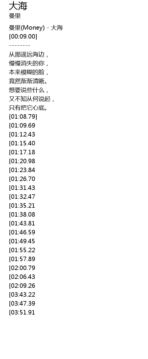 | [00:03.00] | 曼里(Money) - 大海 |