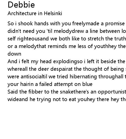 So i shook hands with you freelymade a promise not to clean the slateand i didn't need you 'til melodydrew a line between love and hateand i know i can be self righteousand we both like to stretch the truthbut there's never been a song or a melodythat reminds me less of youthhey there hey theredebbie down debbie down |
