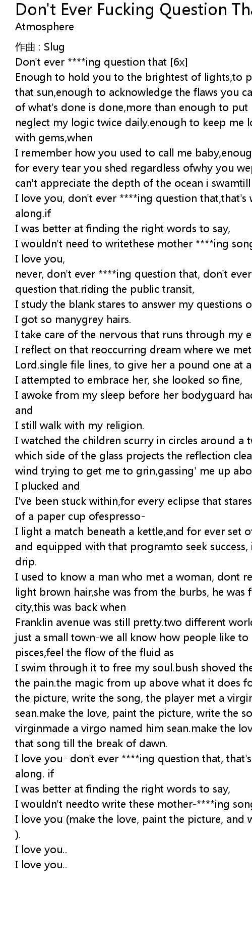 | I love you, don't ever ****ing question that,that's why we'll probably never get along.if | |
