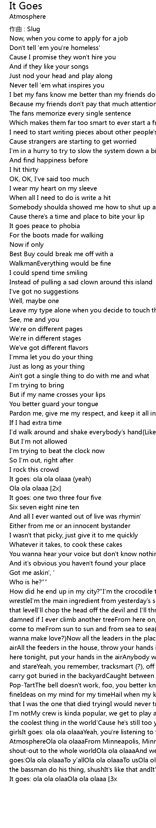 | [2x]It goes: ola ola olaaOla ola olaaa [3x] | How did he end up in my city?"I'm the crocodile that the trucker tried to wrestleI'm the main ingredient from yesterday's specialClose the hole and push that levelI'll chop the head off the devil and I'll throw it at youAnd I'll be damned if I ever climb another treeFrom here on, the squirrels and birds can come to meFrom sun to sun and from sea to sea(Girl, they call me Slug, do you wanna make love?)Now all the leaders in the place, throw your hands in the airAll the feeders in the house, throw your hands in the airAll the thinkers here tonight, put your hands in the airAnybody we forgot, you can stand there and stareYeah, you remember, tracksmart (?), off to a bad startThe way I used to carry got buried in the backyardCaught between a scotch and a cinnamon Pop-TartThe bell doesn't work, foo, you better knock hardLine by line, I'm doing fineIdeas on my mind for my timeHail when my kind does leave behindThey'll find that I was the one that died tryingI would never trade the way I am for the way I'm notMy crew is kinda popular, we get to play a lotAnd my son thinks that I am the coolest thing in the world'Cause he's still too young to fall in love with girlsIt goes: ola ola olaaaYeah, you're listening to the cool sounds of AtmosphereOla ola olaaaFrom Minneapolis, MinnesotaOla ola olaaaGivin' a shout-out to the whole worldOla ola olaaaAnd we'd like to tell all of y'all, it goes:Ola ola olaaaTo y'allOla ola olaaaTo usOla ola olaaNow band, shut up, let the bassman do his thing, shushIt's like that andIt's like that andIt's like this andIt's like this and It goes... |