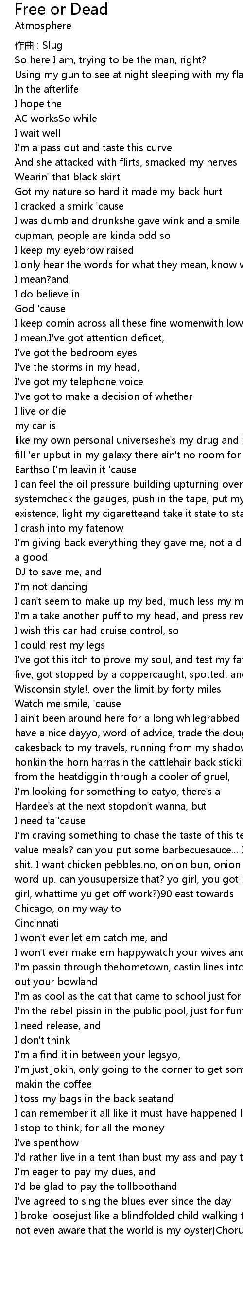 | I ain't been around here for a long whilegrabbed my paper, gave her thanks?, have a nice dayyo, word of advice, trade the doughnuts in and gets some rice cakesback to my travels, running from my shadowspassin hitchhikers and bikers honkin the horn harrasin the cattlehair back sticking to the seat, sweat drippin from the heatdiggin through a cooler of gruel, | |