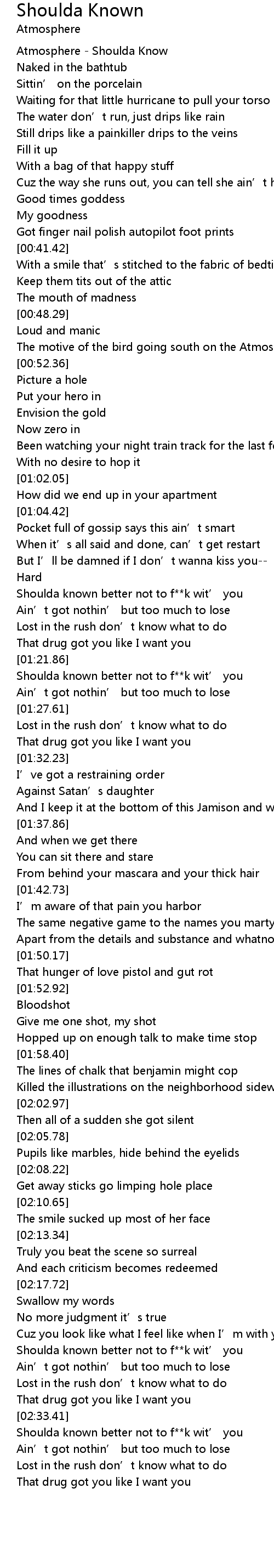 | [00:00.51] | Atmosphere - Shoulda Know |