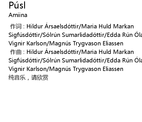 | [00:01.000] | 作曲 : Hildur Ársaelsdóttir/Maria Huld Markan Sigfúsdóttir/Sólrún Sumarlidadóttir/Edda Rún Ólafsdóttir/Gudmundur Vignir Karlson/Magnús Trygvason Eliassen |