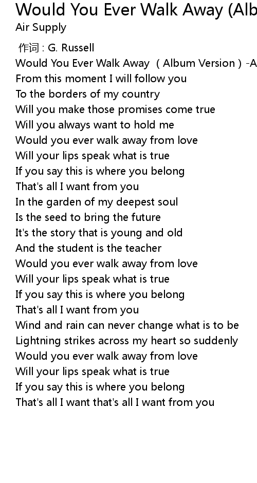 | [00:00.20] | Would You Ever Walk Away (Album Version)-Air Supply |