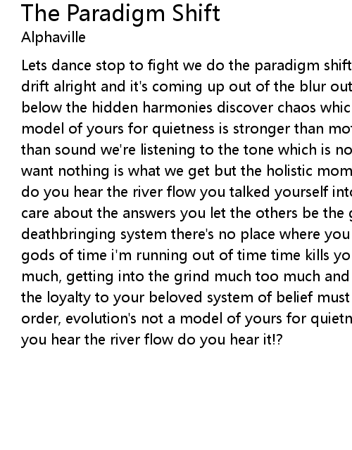 Lets dance stop to fight we do the paradigm shift tonite yeah, it's a natural drift alright and it's coming up out of the blur out of your mind from deep below the hidden harmonies discover chaos which means order evolution's not a model of yours for quietness is stronger than motion and silence is stronger than sound we're listening to the tone which is not played nothing is what we want nothing is what we get but the holistic moment of all yes that is the way do you hear the river flow you talked yourself into wrong questions you don't care about the answers you let the others be the good ones you're part of the deathbringing system there's no place where you can hide stop! chasing the wrong gods of time i'm running out of time time kills you're lowering hopes much too much, getting into the grind much too much and losing faith in your abilities the loyalty to your beloved system of belief must surrender to chaos which means order, evolution's not a model of yours for quietness is stronger than motion do you hear the river flow do you hear it!? |