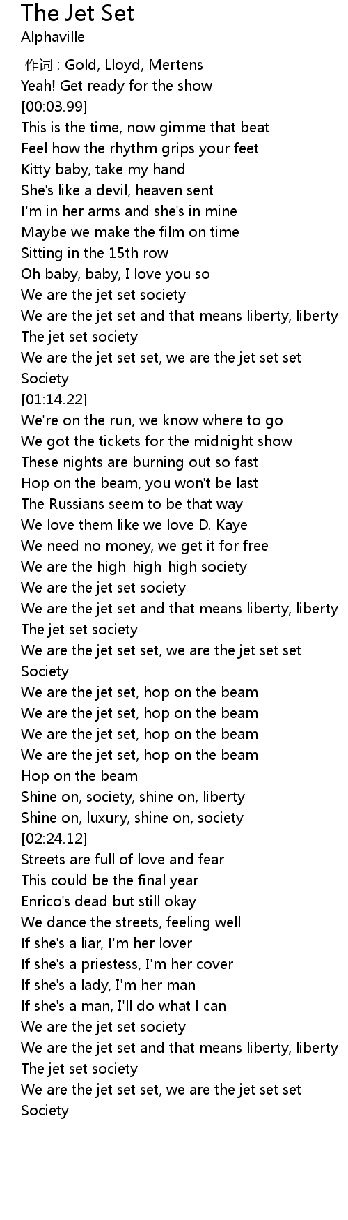 | [01:43.25] | We are the jet set set, we are the jet set set |