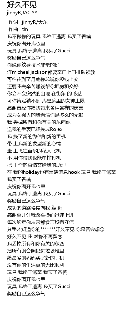 | [00:23.455] | 我不做你的玩具 我终于逃离 我买了香槟 |