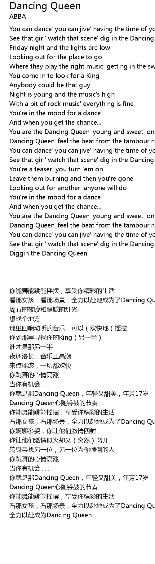 | [01:26.419] | You are the Dancing Queen' young and sweet' only seventeen |