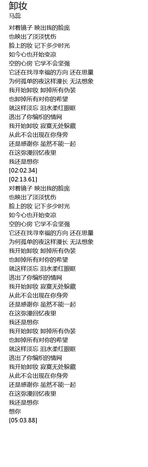 | [01:35.05] | 我开始卸妆 寂寞无处躲藏 |