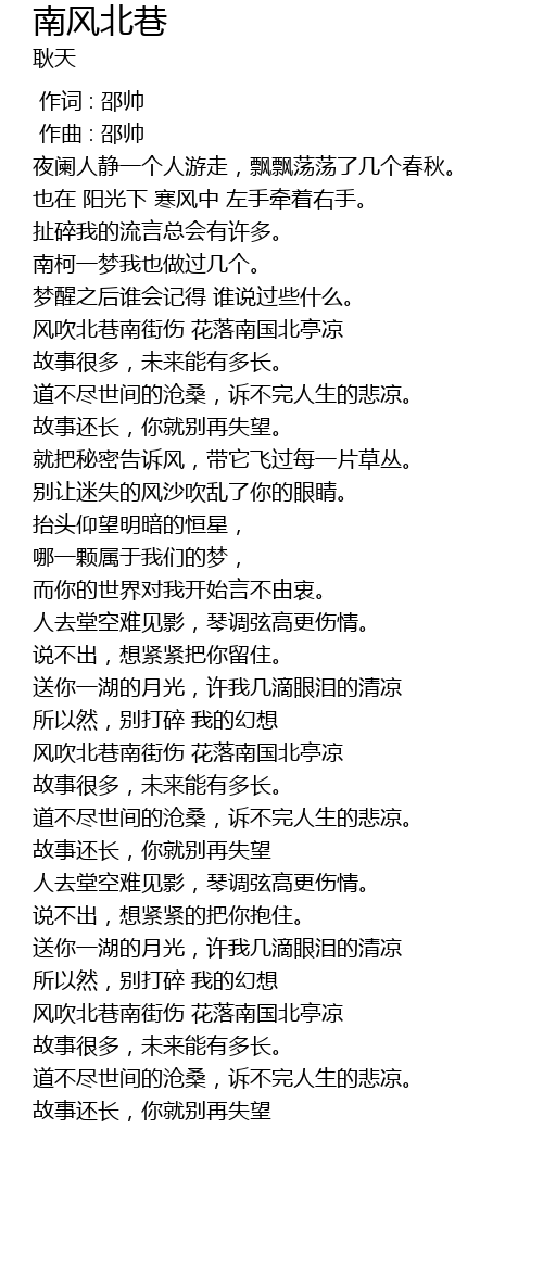 | [03:34.025] | 风吹北巷南街伤 花落南国北亭凉 |
