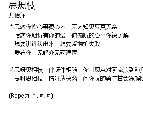 | 思呀思相枝 情呀放袂离 问你阮的勇气甘会冻解阮的相思 | |