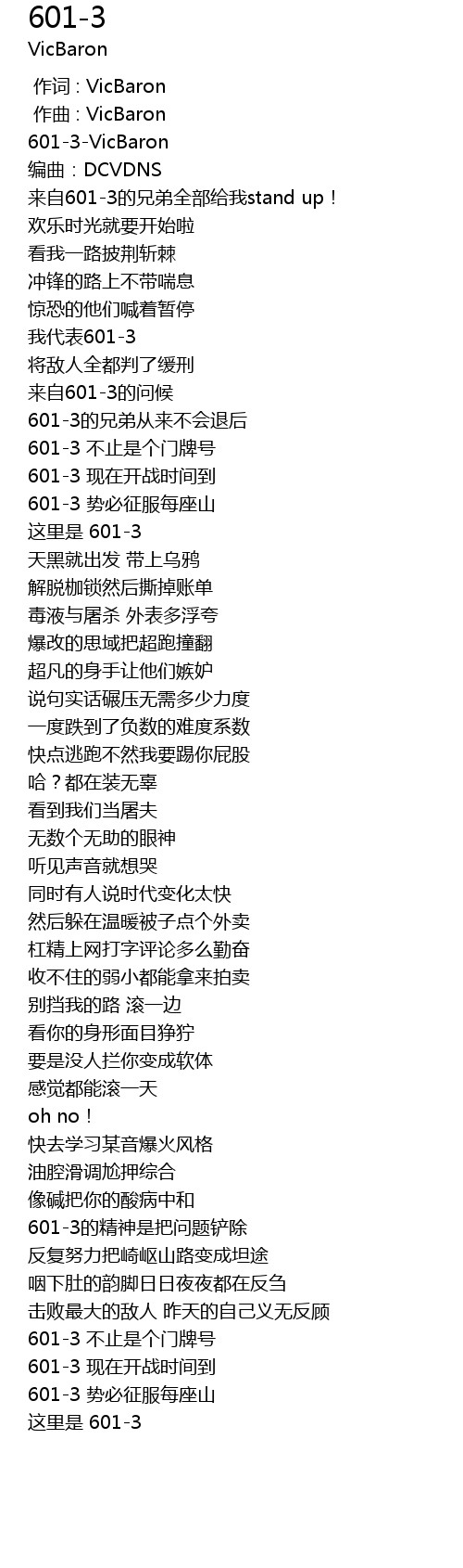 | [00:02.927] | 来自601-3的兄弟全部给我stand up! |