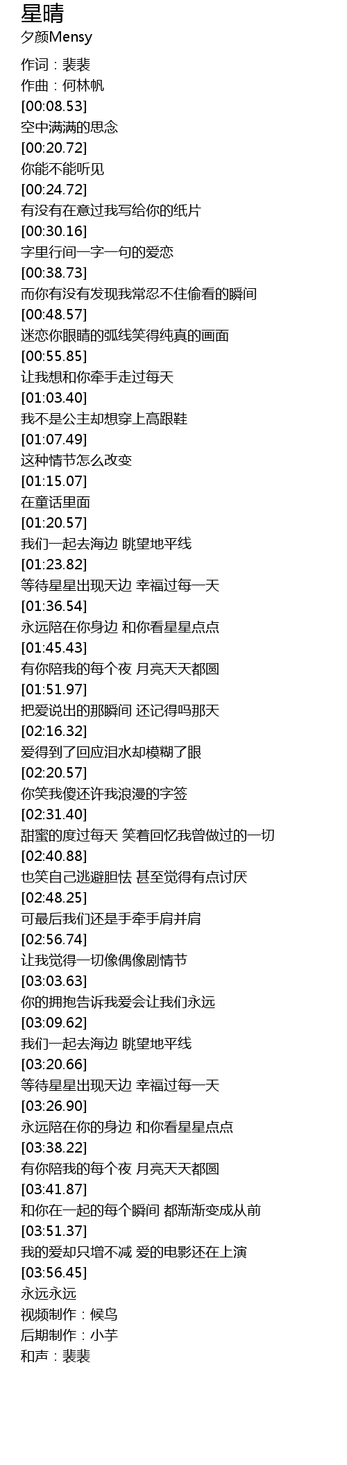 | [03:29.75] | yǒng yuǎn péi zài nǐ de shēn biān hé nǐ kàn xīng xīng diǎn diǎn |