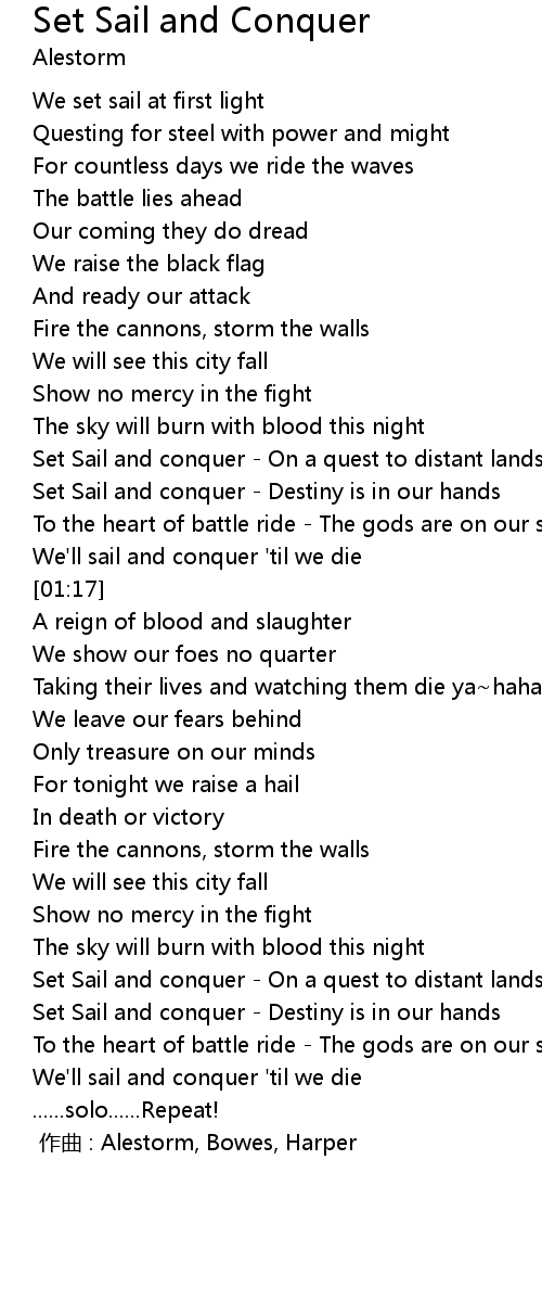 | [01:15] | We'll sail and conquer 'til we die |